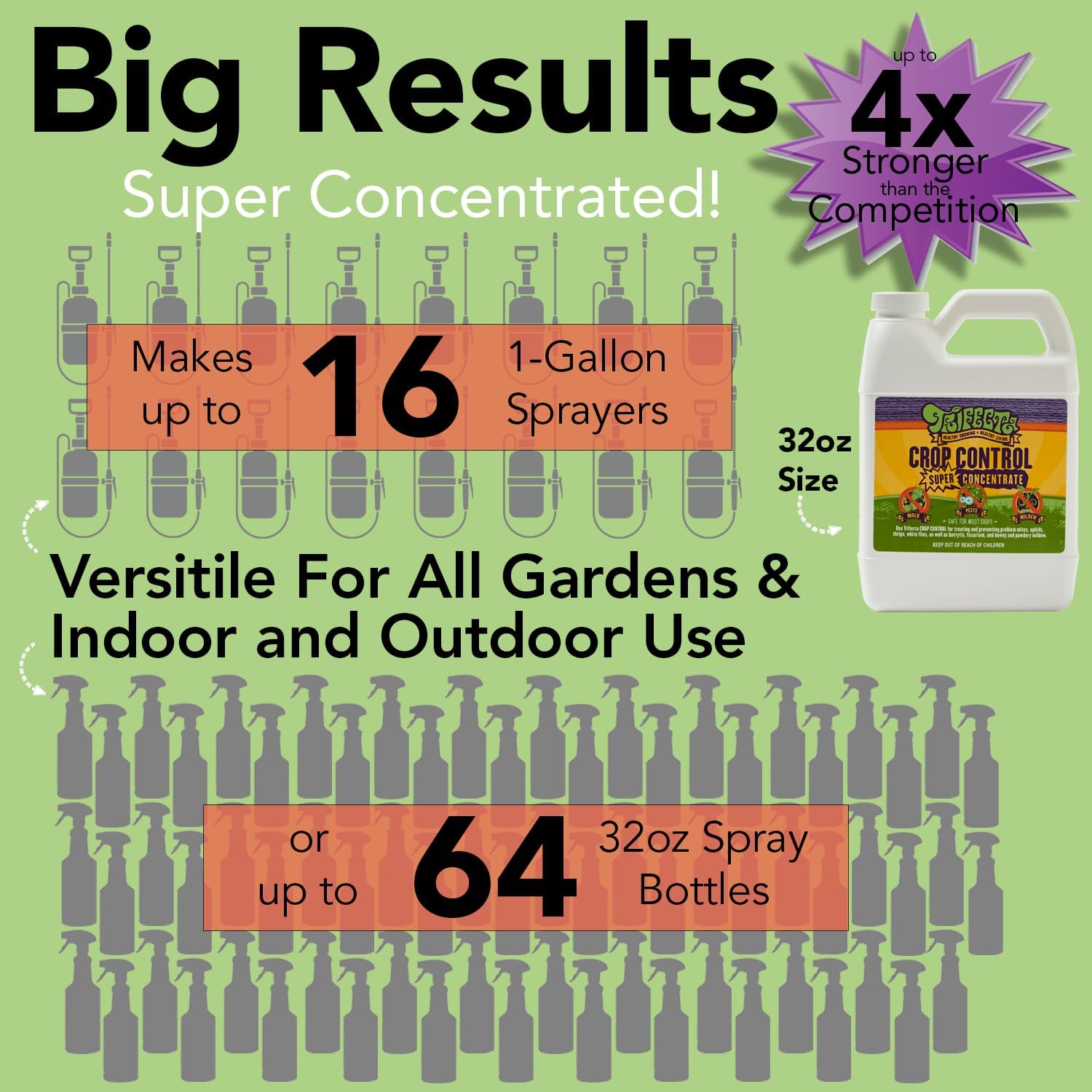 - SUPER CONCENTRATED FORMULA SIMPLE AND EASY TO USE - Every 1/2 ounce of Trifecta Crop Control makes one gallon of ready to use spray - Simply mix with water and spray on your plants to prevent and cure up to one week before harvest and stay free of mildew, mites and mold. The simultaneous modes of action create a powerful defense system that stops fungal and parasitic species dead in their tracks